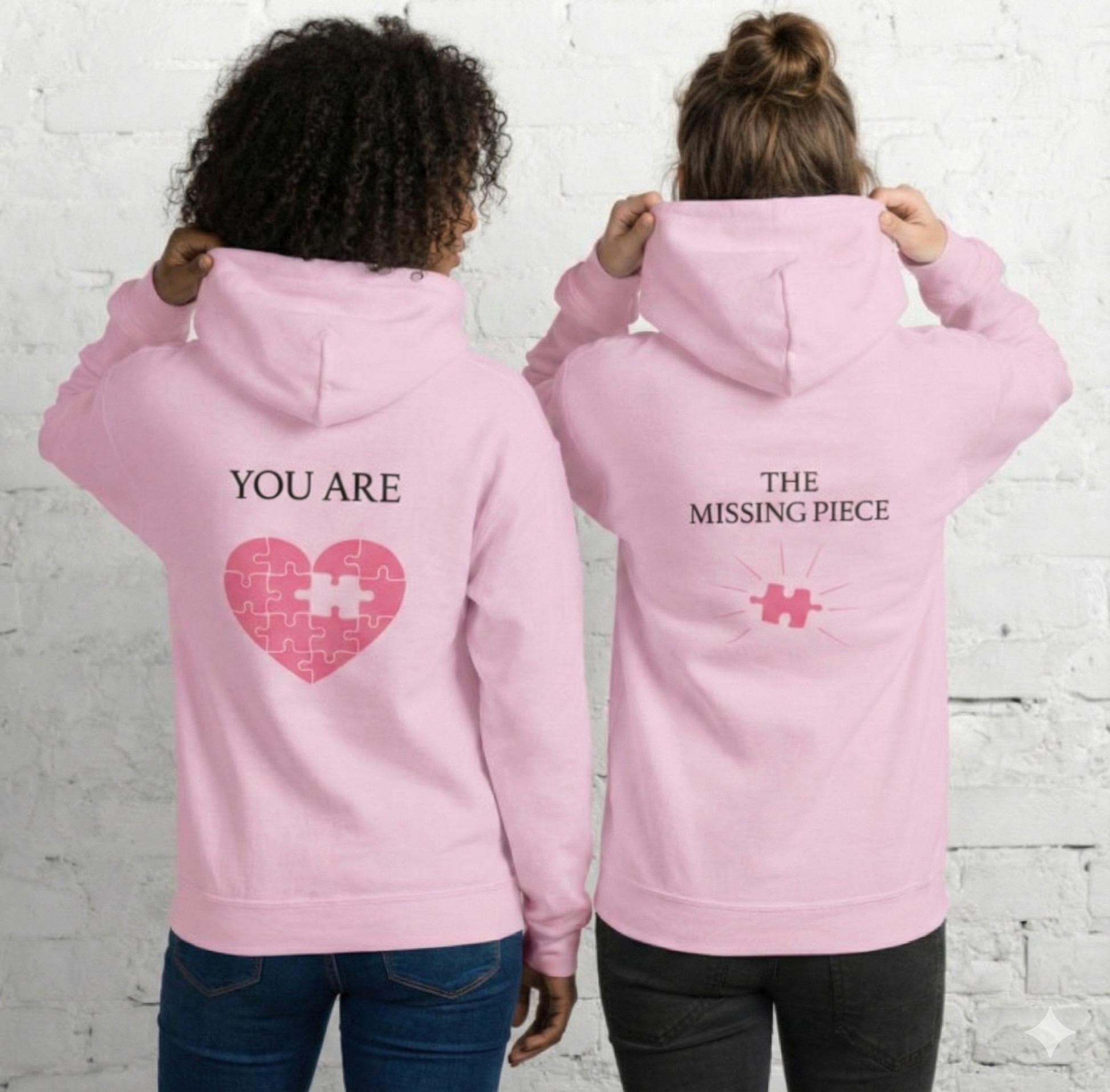 The first hoodie reads “You are the” above a heart built from puzzle pieces, with one piece missing. The second completes the thought with “Missing Piece”, showing that final puzzle piece in place.
